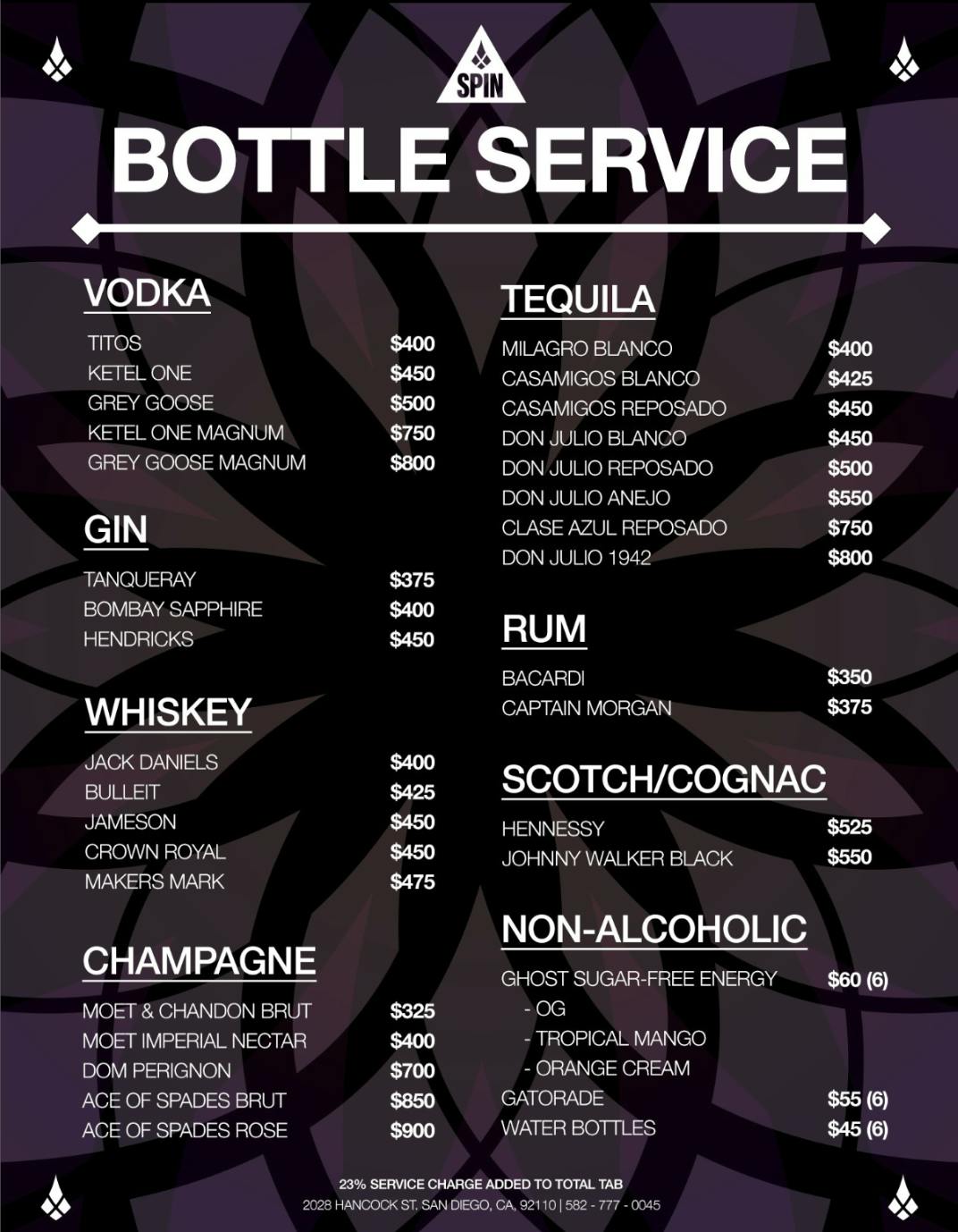 Keep in mind that bottle menus at Spin are subject to change. Special events and holidays may also have different menus available.